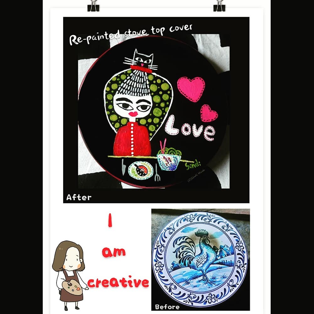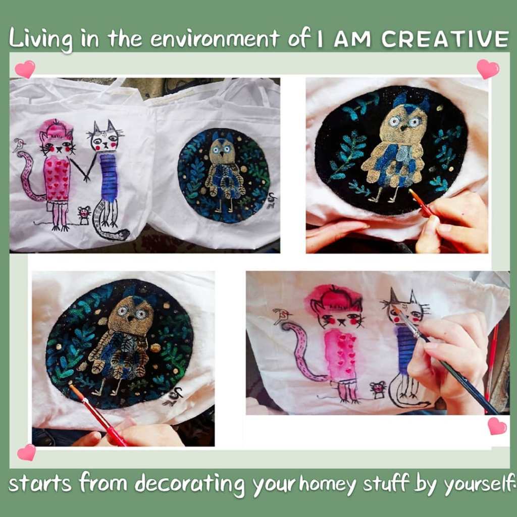 🌻Living in the environment of “ I AM CREATIVE ” , starts from decorating your homey stuff by yourself. 🌻Being creative in a rainy Sunday morning. 🌻Great artworks from today’s mini workshop.😁 (drawing on 100% cotton handbags) 🌻 Based on the concept of Recycle and Reuse- I asked participants to bring their own homey stuff they want to draw/decorate and bring it to the workshop. 😁.