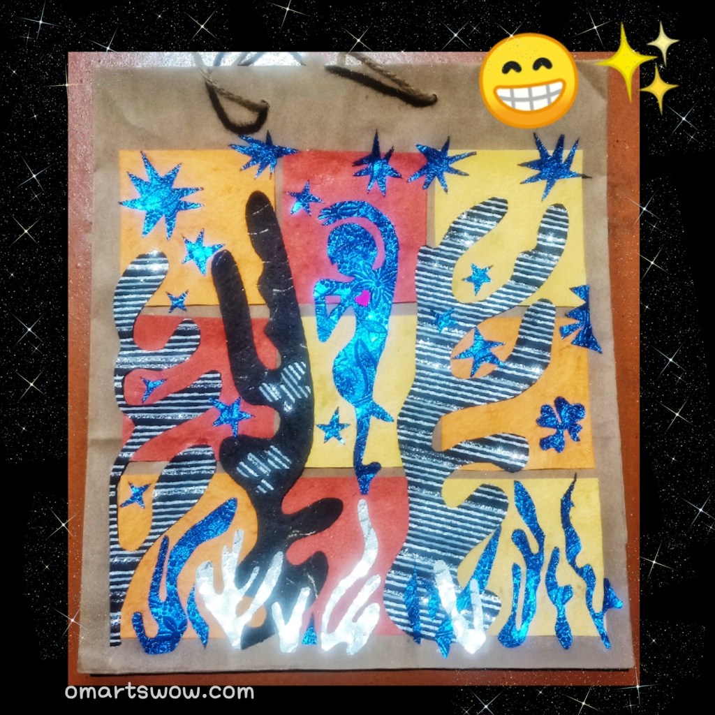 🌻Inspired by Matisse’s artworks, I just had some art creating fun by painting with scissors and recycled materials (wrapping paper& brown paper bag).✨Art creating has the magic to enable you losing yourself in the serial activity (cutting & gluing😁) as a way to quiet the mind.✨