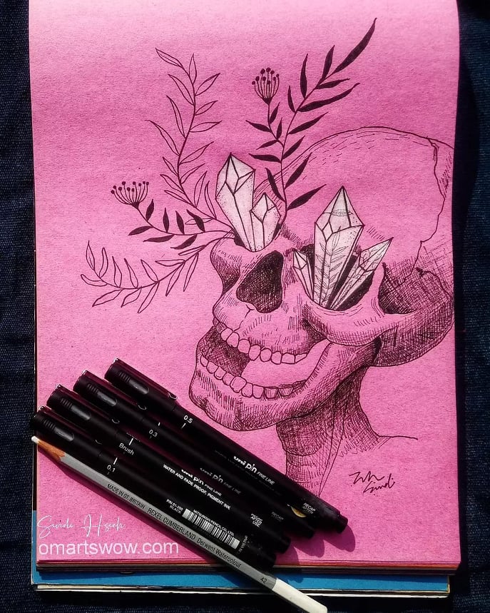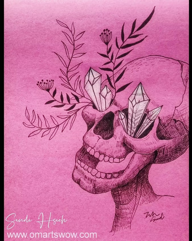 Never a big fan of skeleton.But I decided to face my fear with pink background , clear crystals and live growing plants. 我不是很喜歡(其實有點怕)骷髏頭,為了面對這恐懼,我決定用粉紅色的紙,以及生長中的花草植物來面對。