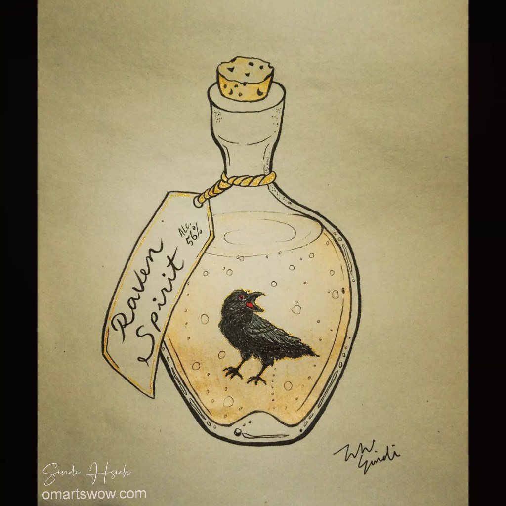 🥃 The spirit here is alcohol. So I created a fake alcohol brand – Raven Spirit. 😁😂
