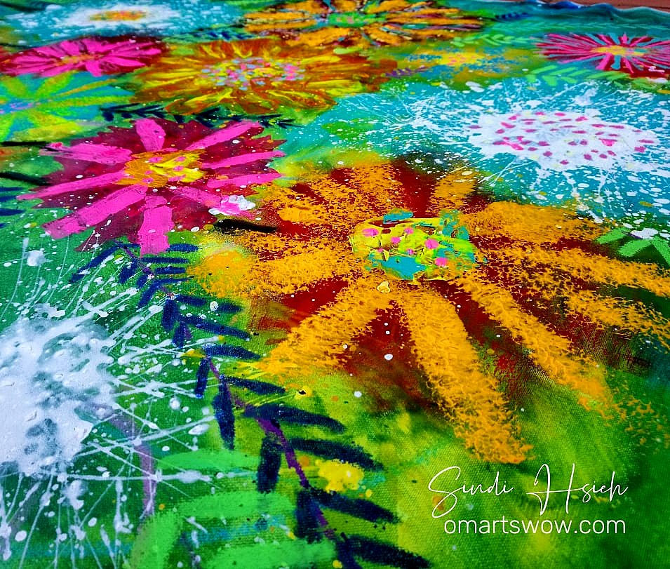 Somehow the abstract painting turns into a huge flower garden with ferns growing in between.