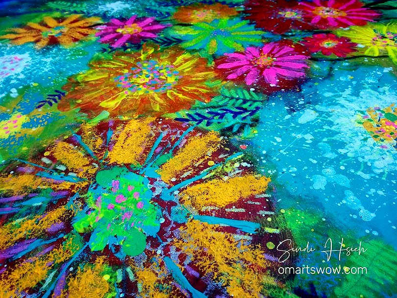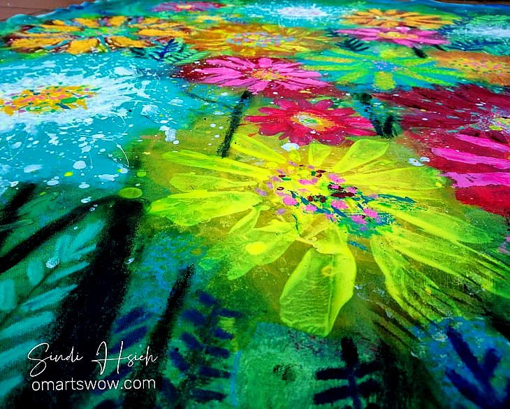 Somehow the abstract painting turns into a huge flower garden with ferns growing in between.